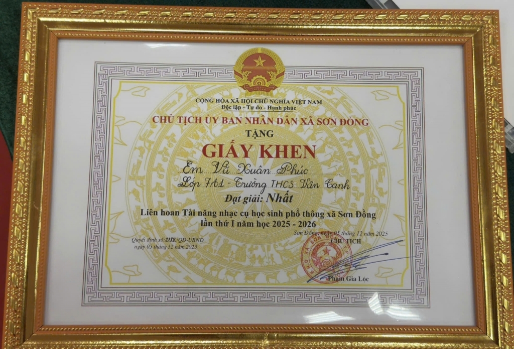 Trong một sự kiện được tổ chức lần đầu tiên tại xã Sơn Đồng, thành tích của Phúc lại càng trở nên ý nghĩa hơn, là minh chứng rõ nét cho quá trình rèn luyện nghiêm túc, sự cố gắng bền bỉ và tài năng nổi bật của em. Thành công ấy cũng là niềm tự hào của gia đình, thầy cô và tập thể Trường THCS Vân Canh – nơi luôn đồng hành, bồi dưỡng và tạo điều kiện để mỗi học sinh được tỏa sáng trên hành trình theo đuổi đam mê nghệ thuật.